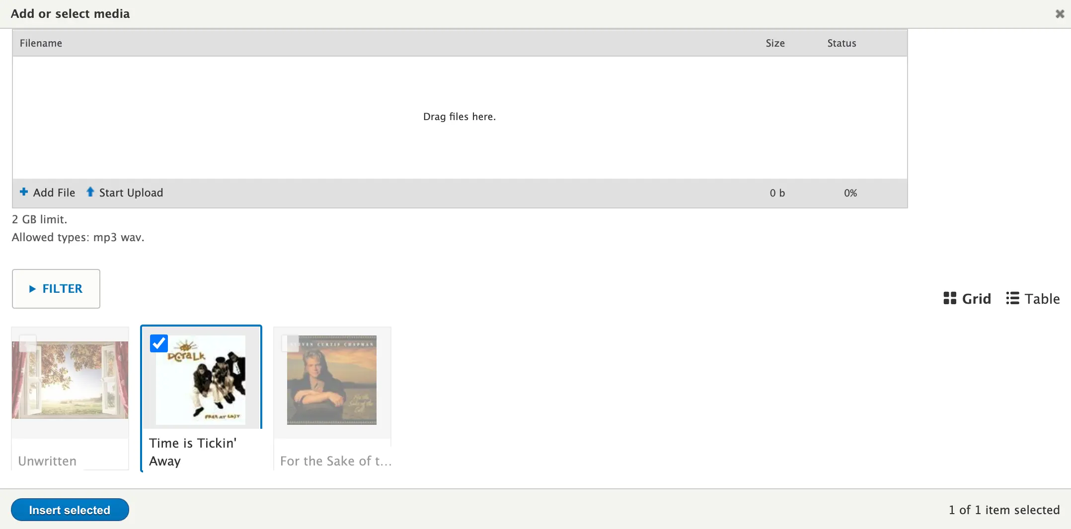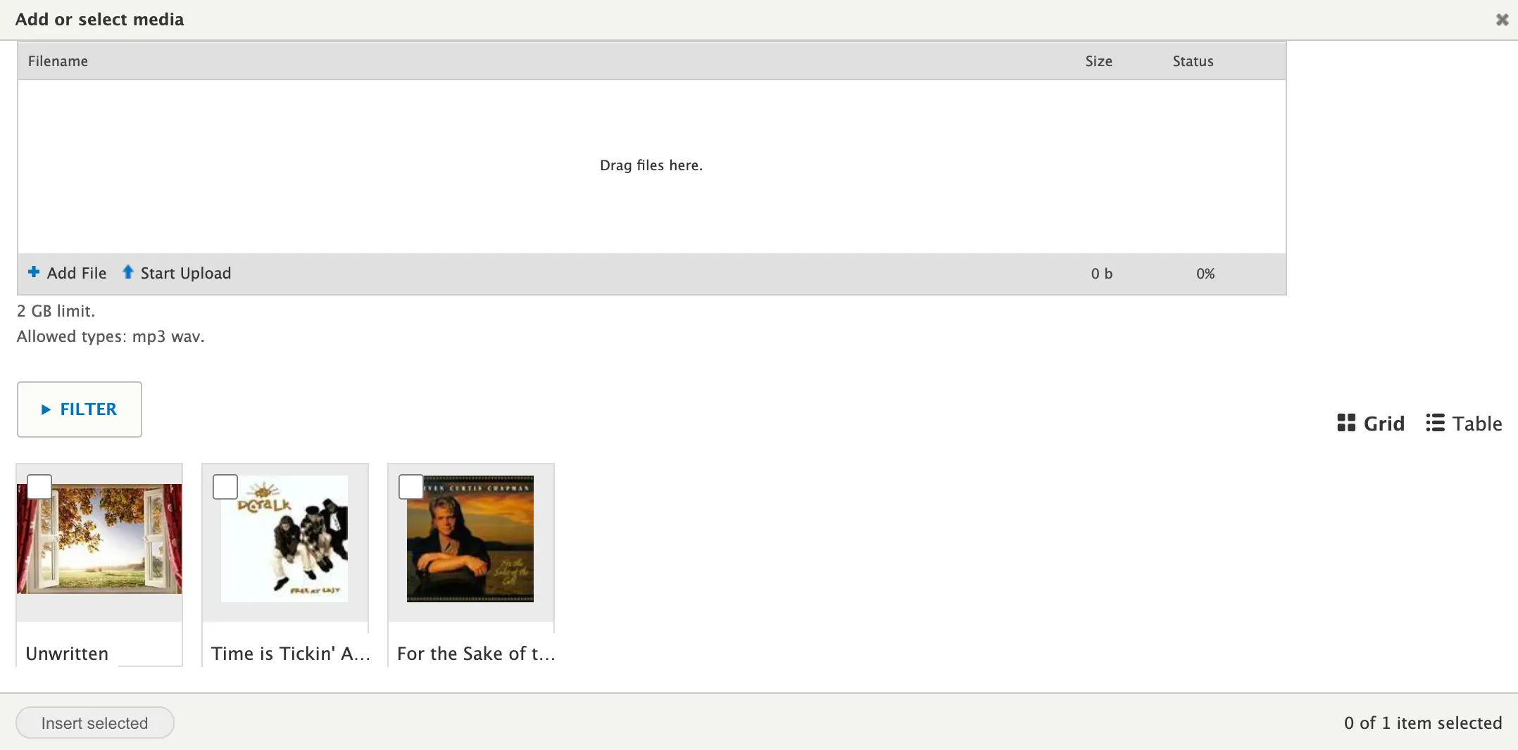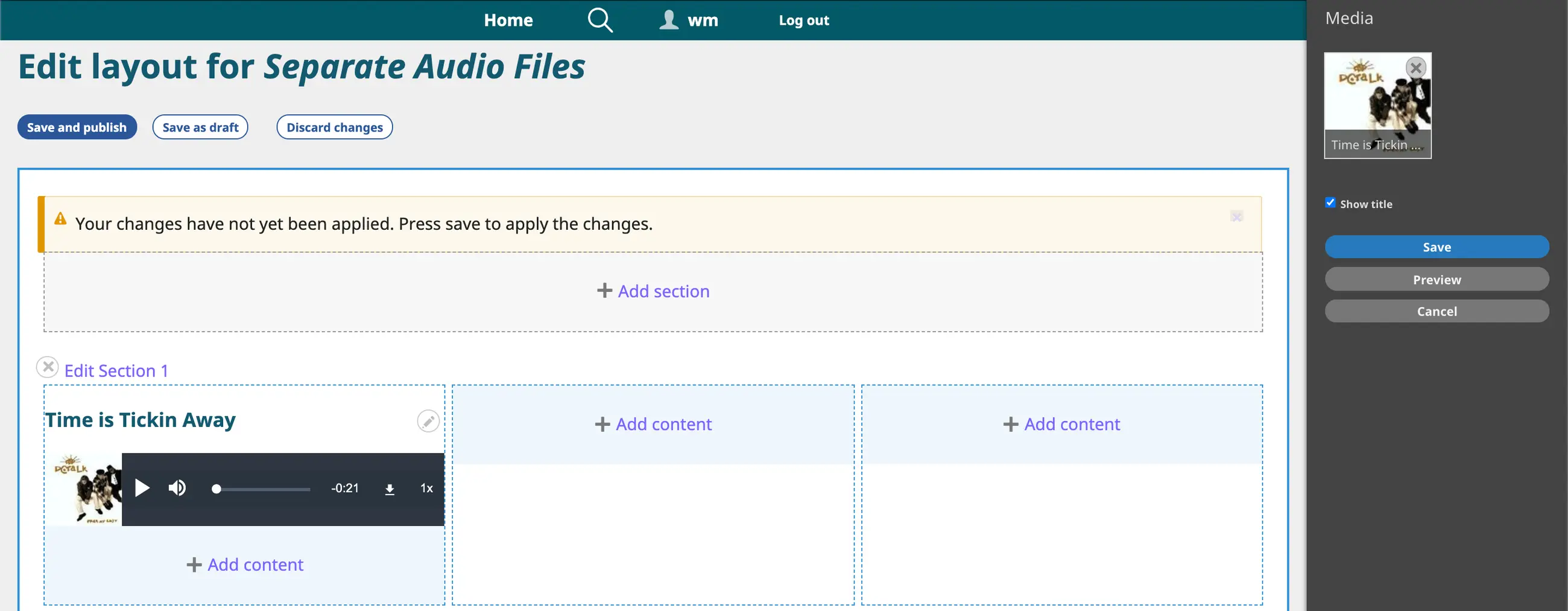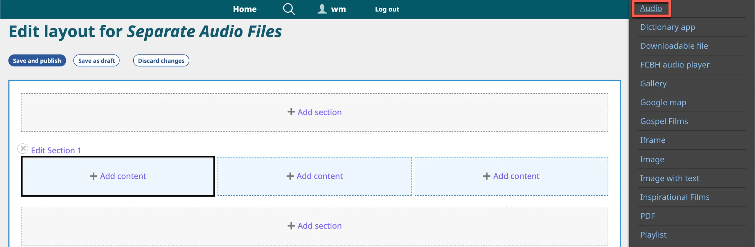 3. Audio files are “block content”; you may insert an audio Content block in any area of a section layout.