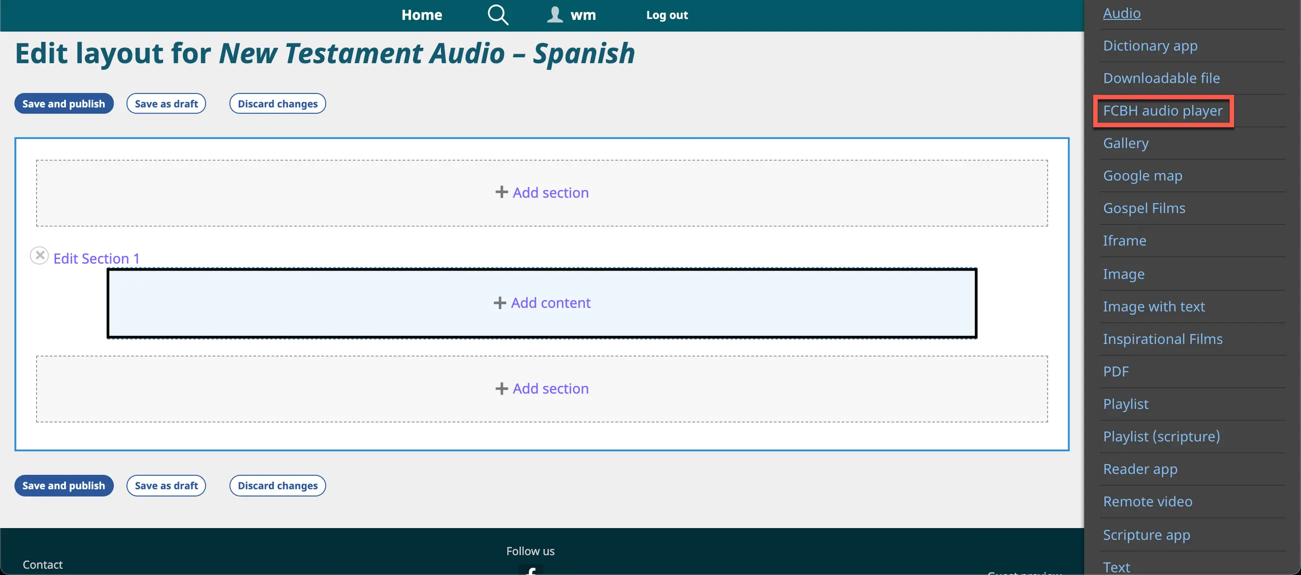 2. Select the Content block to which you want to add a FCBH player by clicking on a + Add content link.