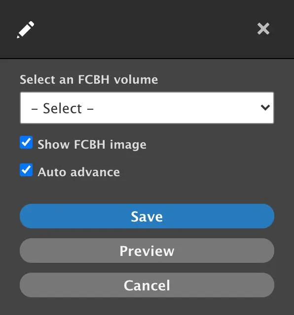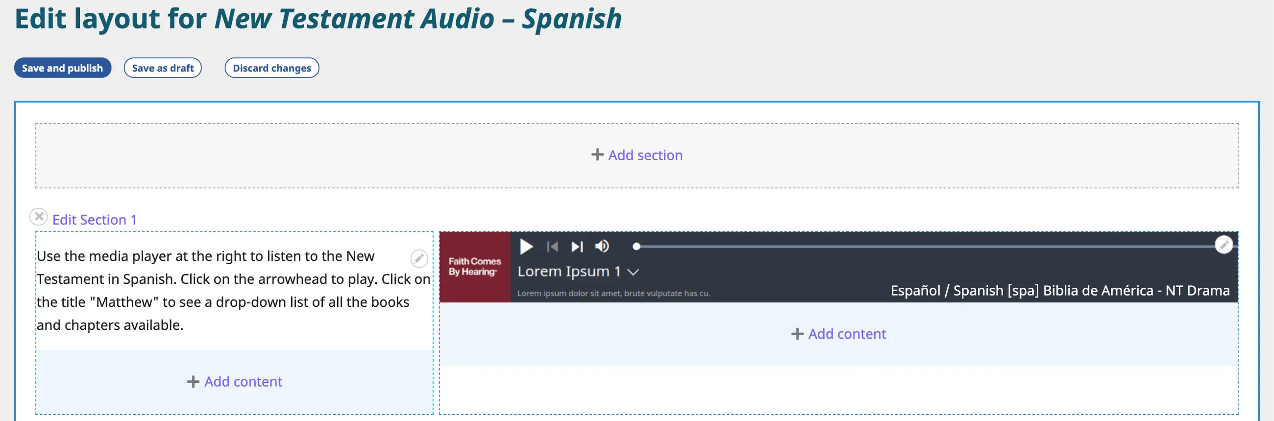10. We recommend that you include a Text content block on the page with brief instructions for using the FCBH audio player.