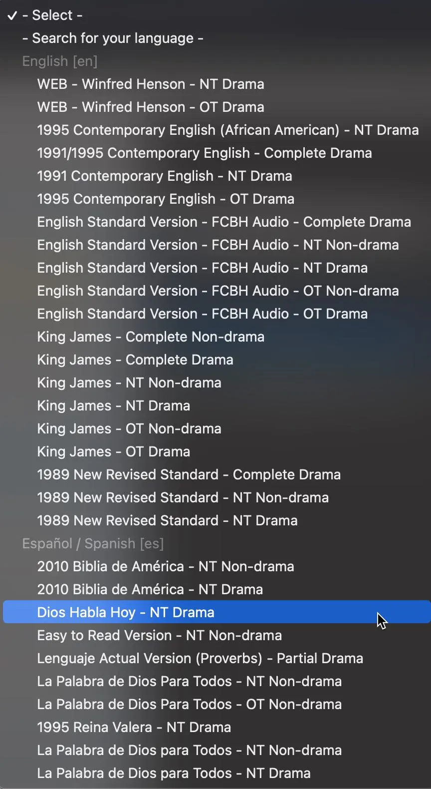 5. A new sidebar opens with features to select a language volume for the FCBH player.