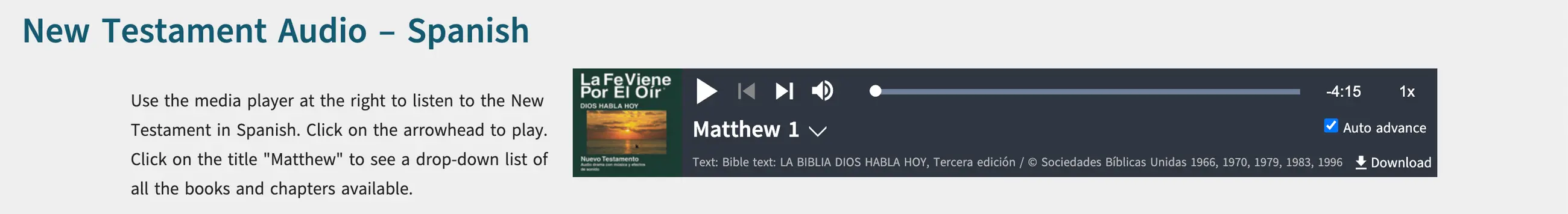 Example text: Use the media player at the right to listen to the New Testament in Spanish. Click on the arrowhead to play. Click on the title "Matthew" to see a drop-down list of all the books and chapters available.