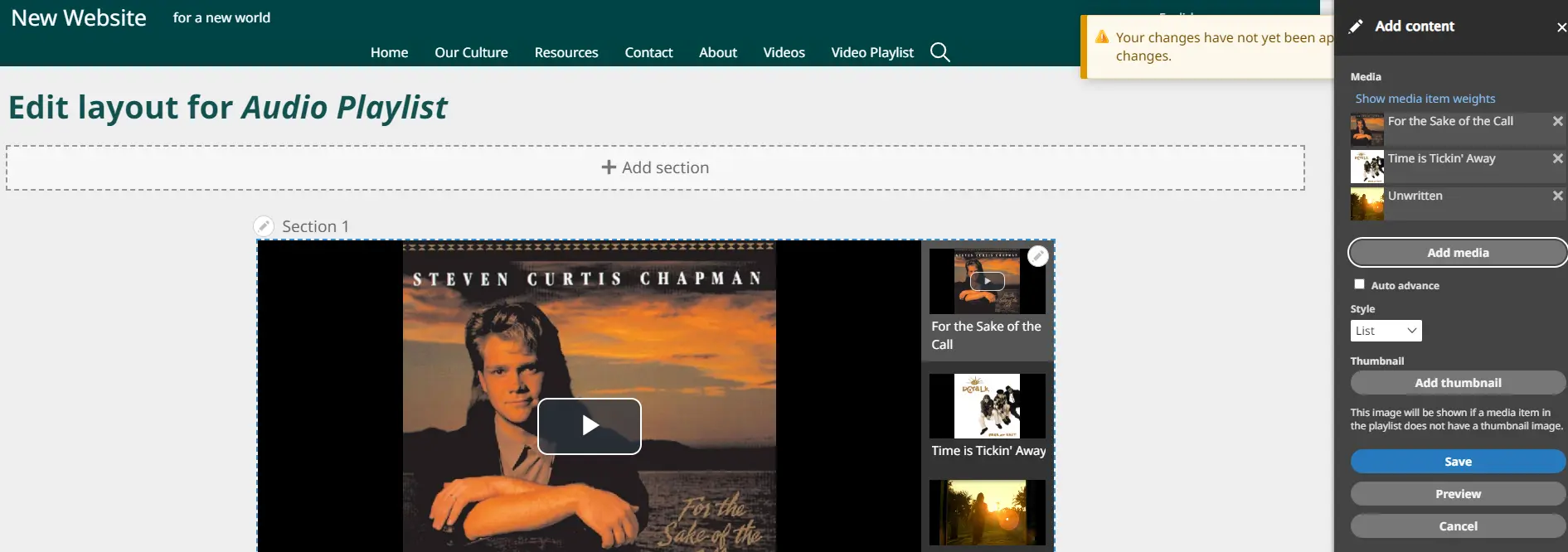 g) The audio playlist now appears in both the layout panel on the left and in the sidebar on the right.