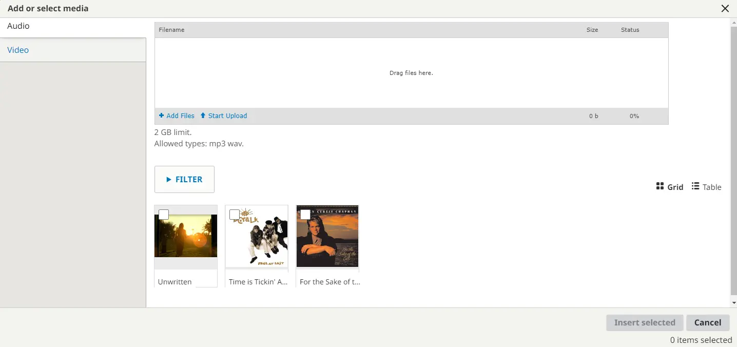 d) If you have already uploaded audio files to your website, they will appear in the lower section of the working box.