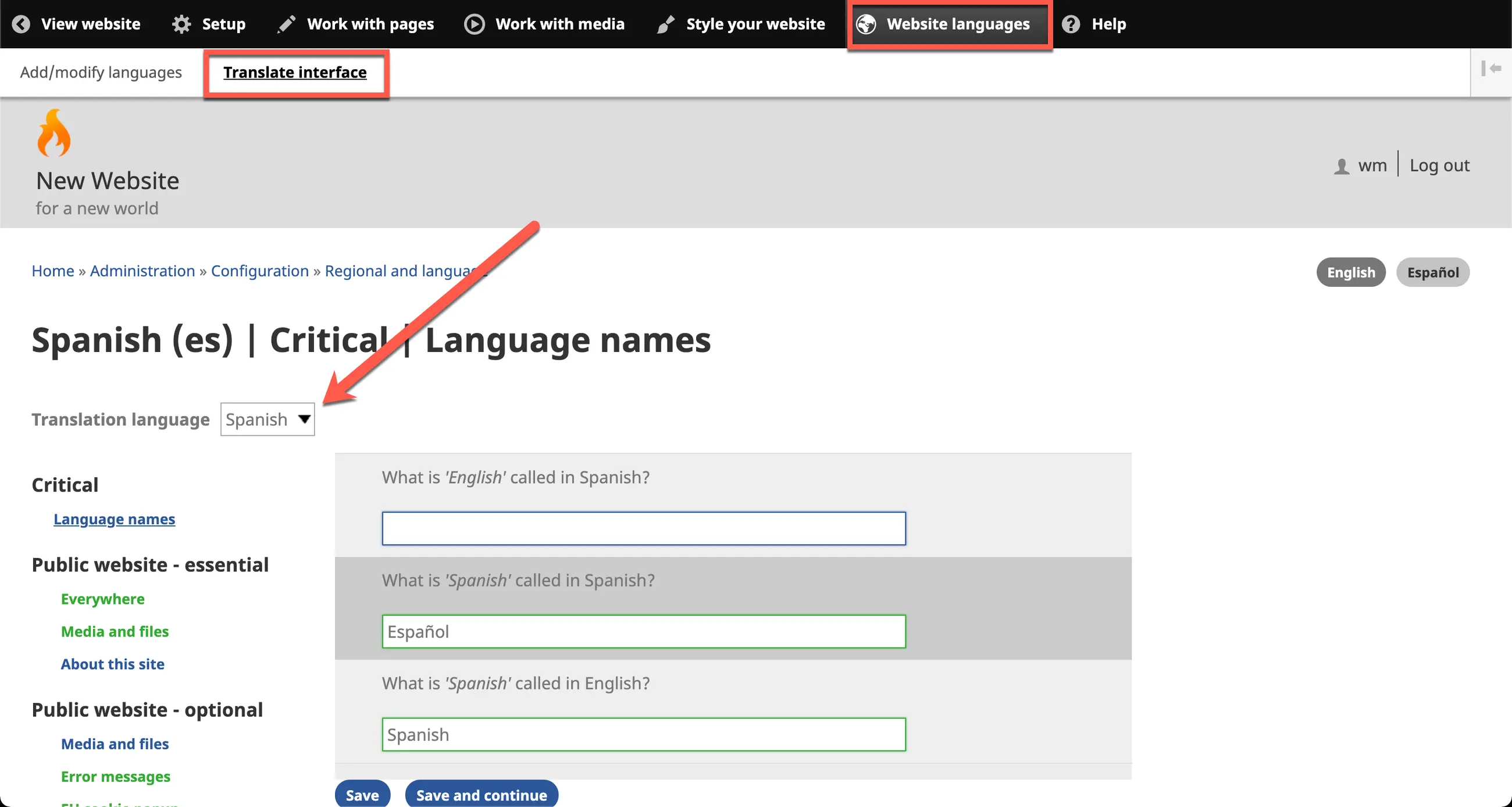 1. In the Wildfire menu, click on Website languages, then click on submenu item Translate interface.