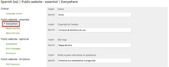 2. If one of your Navigation Languages is a “language of wider use” (trade language) that will be used on several websites, a single set of interface translations may be completed, then shared among websites. Ask your Digital Publishing Manager or workshop facilitator for help.
