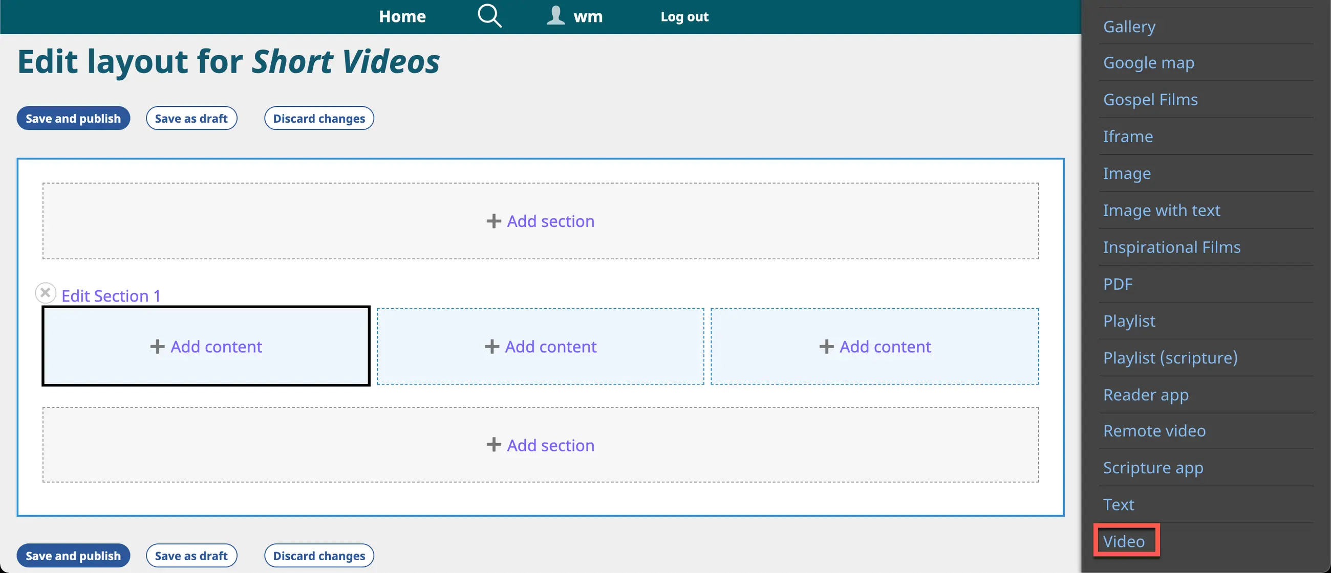 3. Videos are “block content”; you may insert a video block in any area of a section layout.