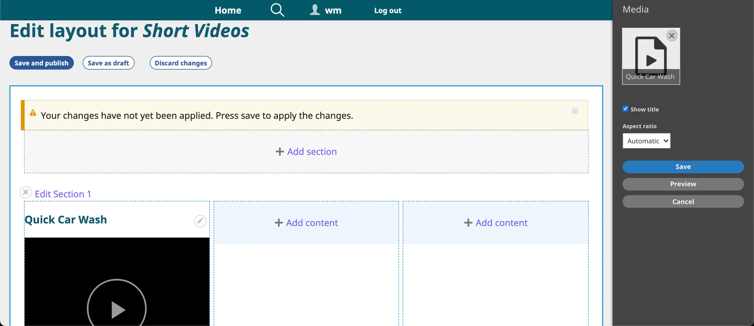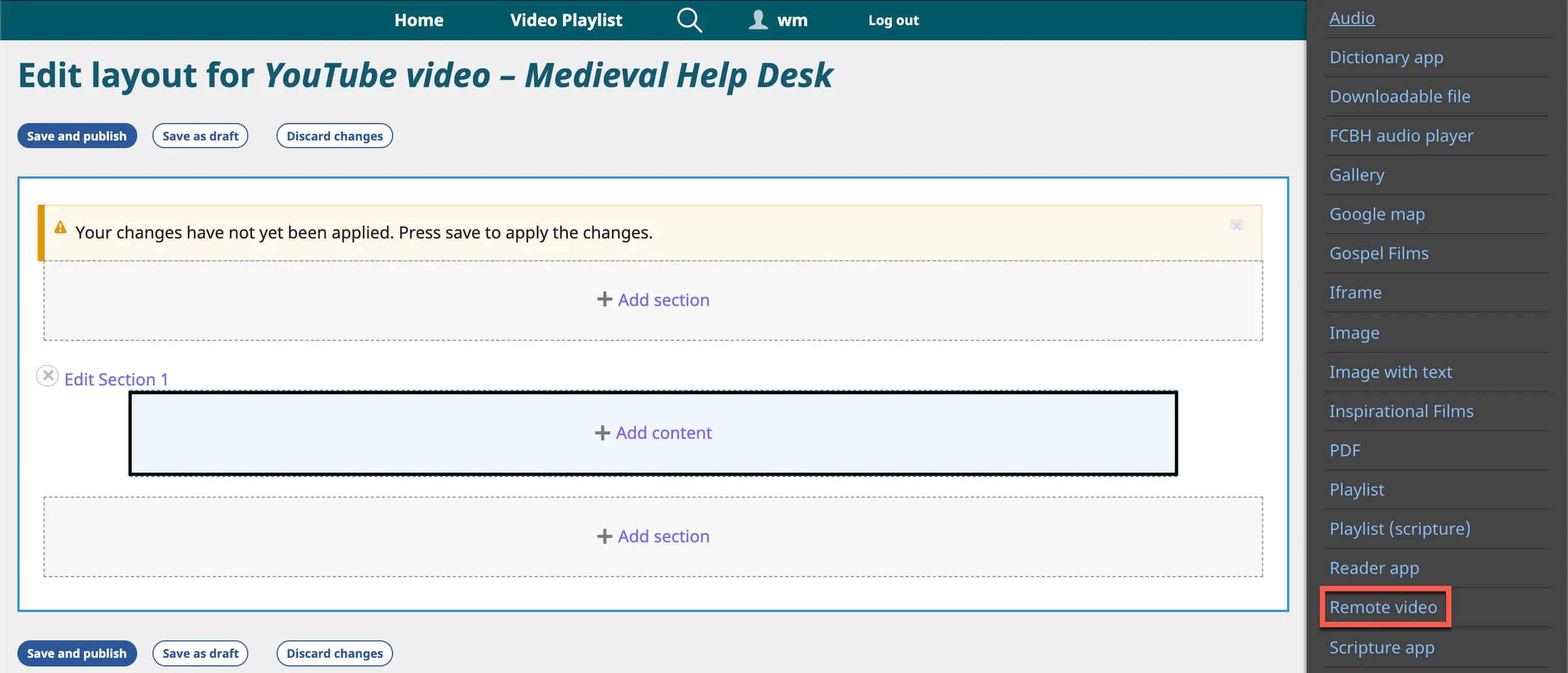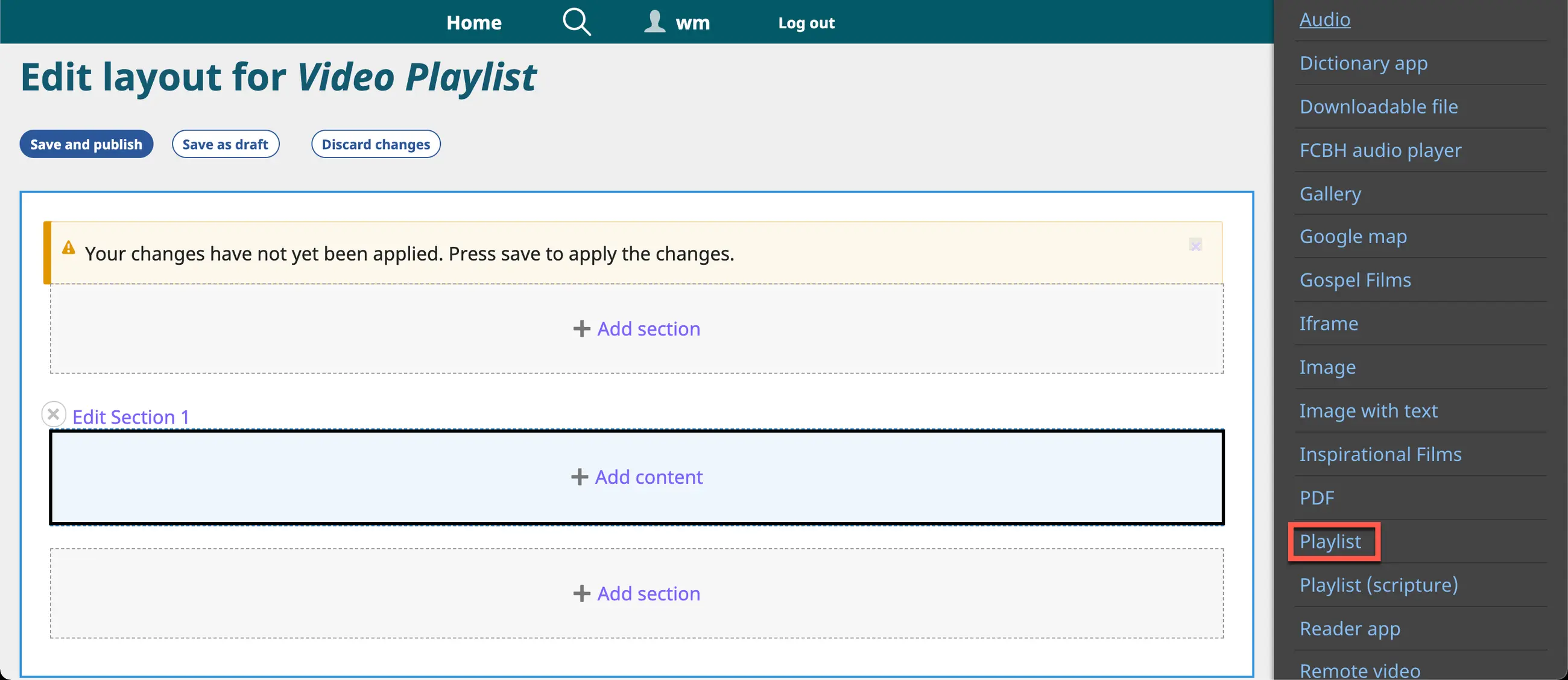 5. Prepare a Section and select a Content Block for the playlist.