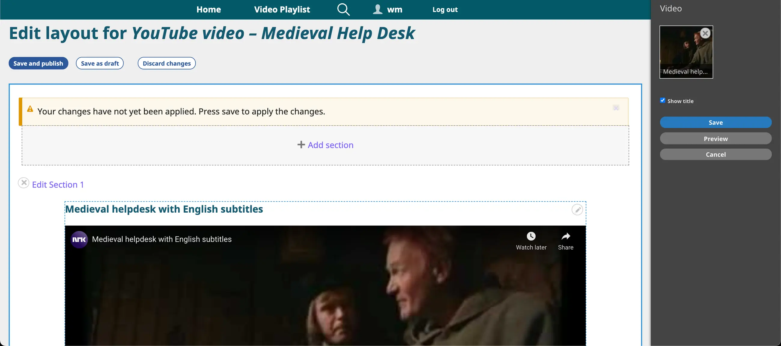 g) The video playlist now appears in both the layout panel on the left and in the sidebar on the right.