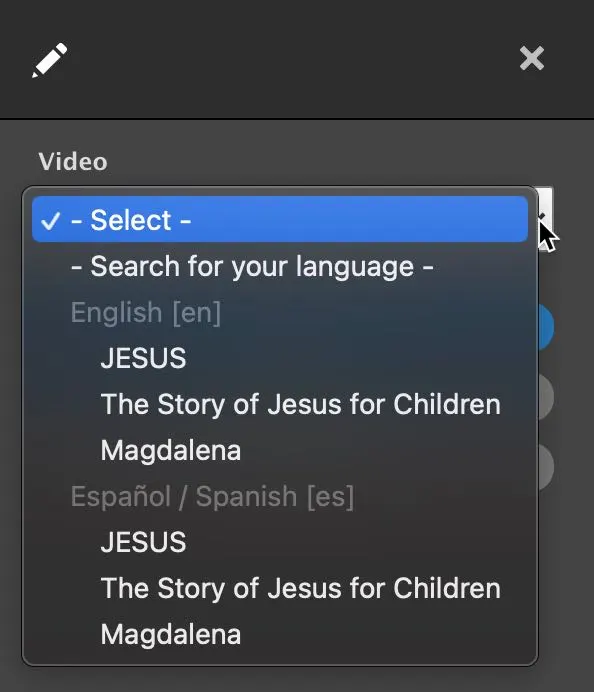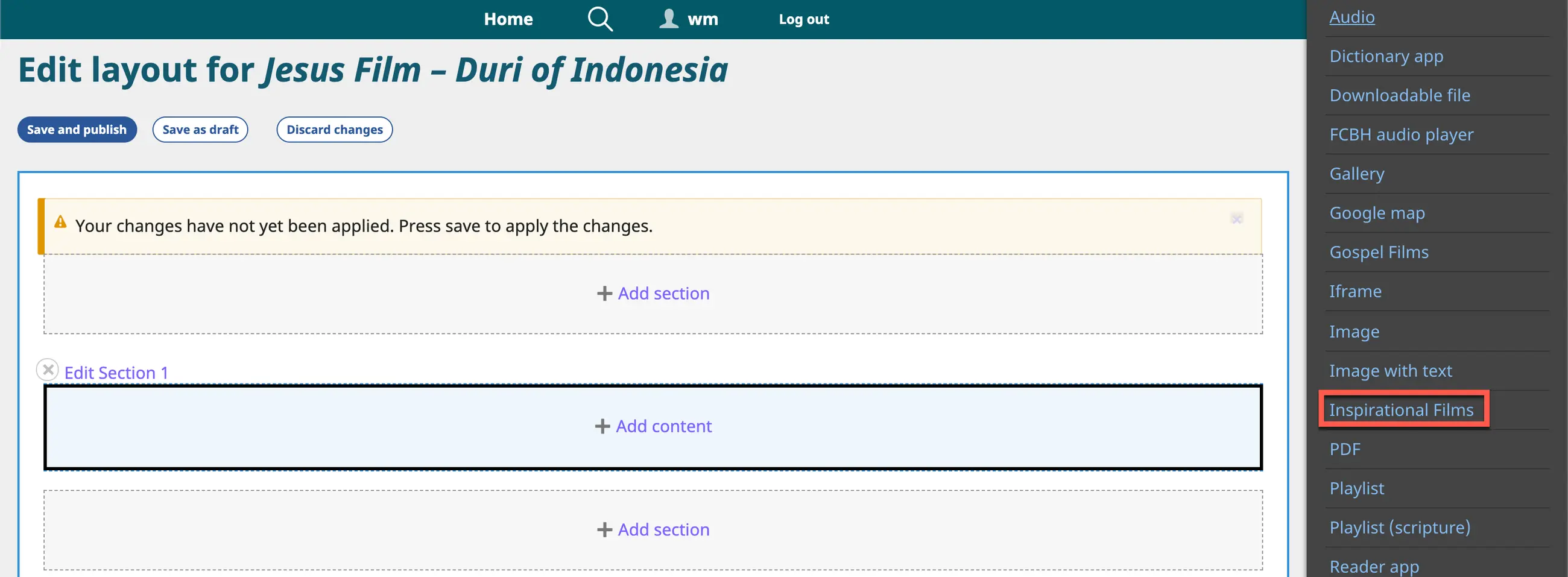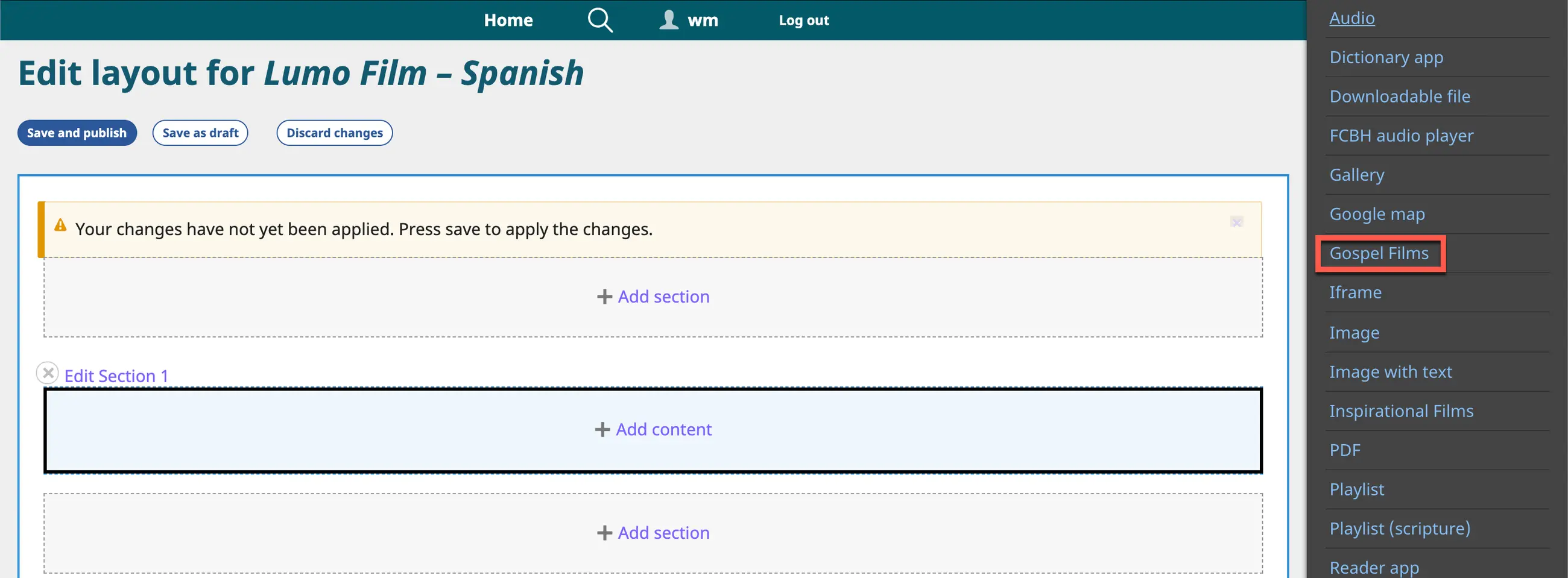 4. Select the Content block to which you want to add a Gospel Film by clicking on a + Add content link.