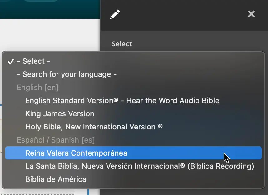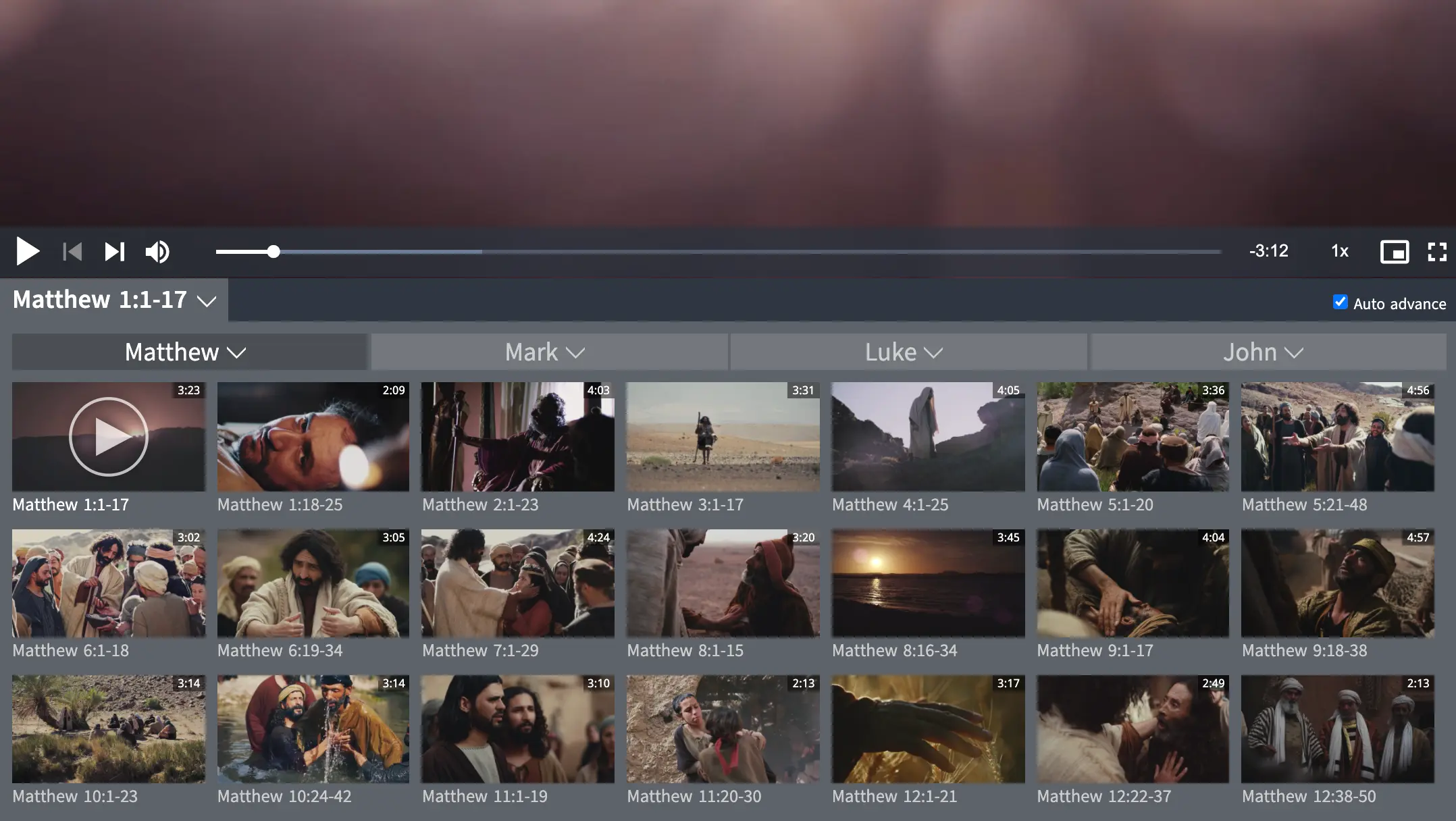 2) At the top of the grid, click on a book name to change the Scripture version of the Lumo film.