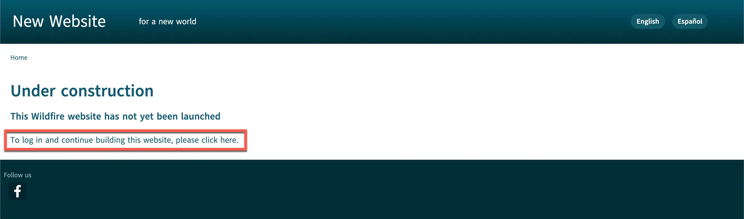 3. Click on the link to log in and continue building your website. If your website has been launched, you will see the public Home page of the website. To log into the Wildfire Website Builder System and work on your website, click on the Log in link at the top right of the screen.