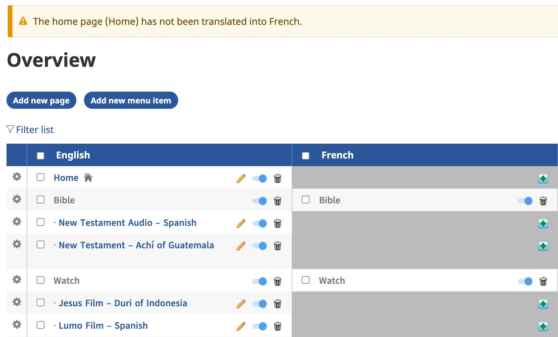 1) If you added a new Navigation Language in the Initial Setup Guide, you will see a column for that language with no page titles listed.