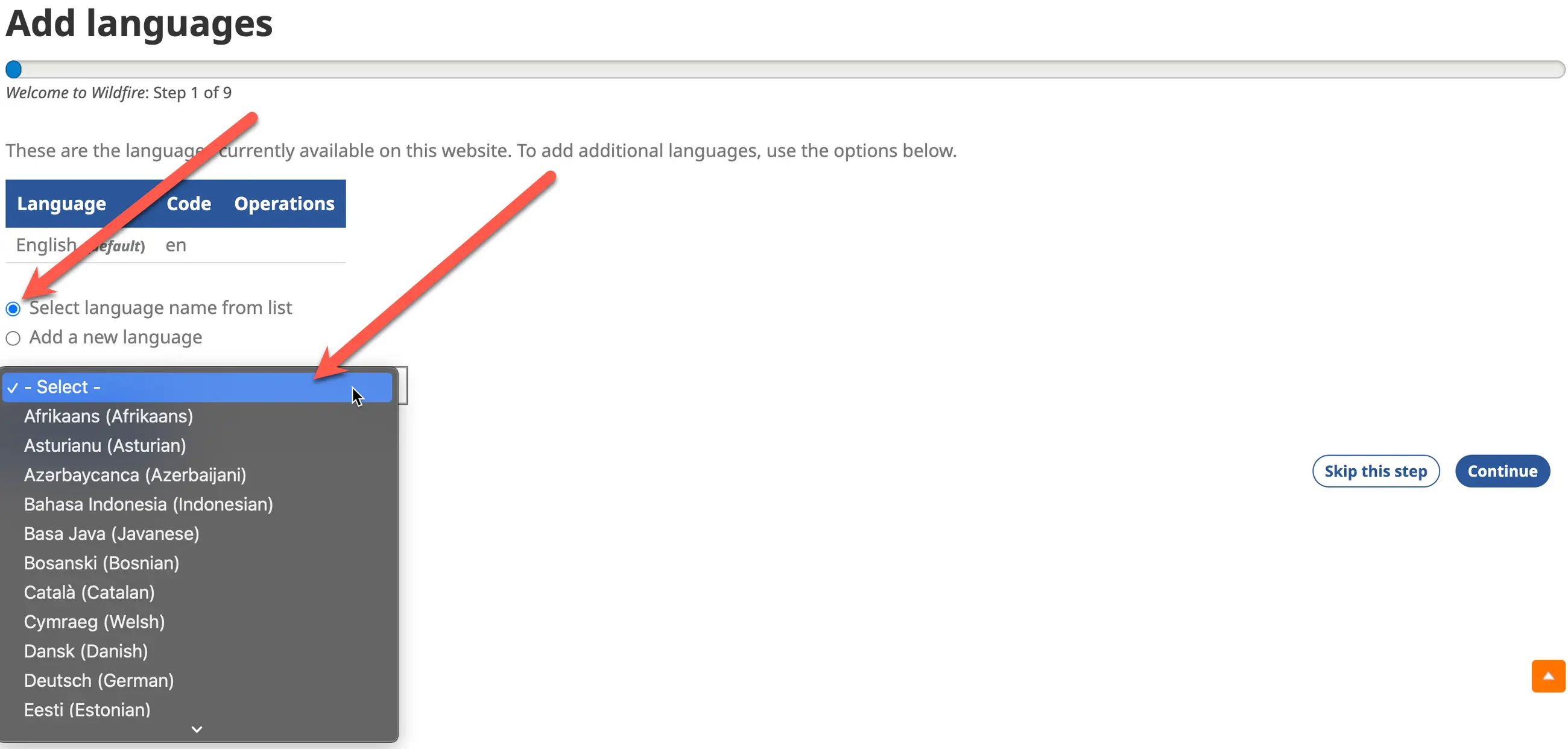 b) Click on the drop-down menu and scroll through the list of languages already in the Wildfire system. If your language is not listed, go to Step 4 below.