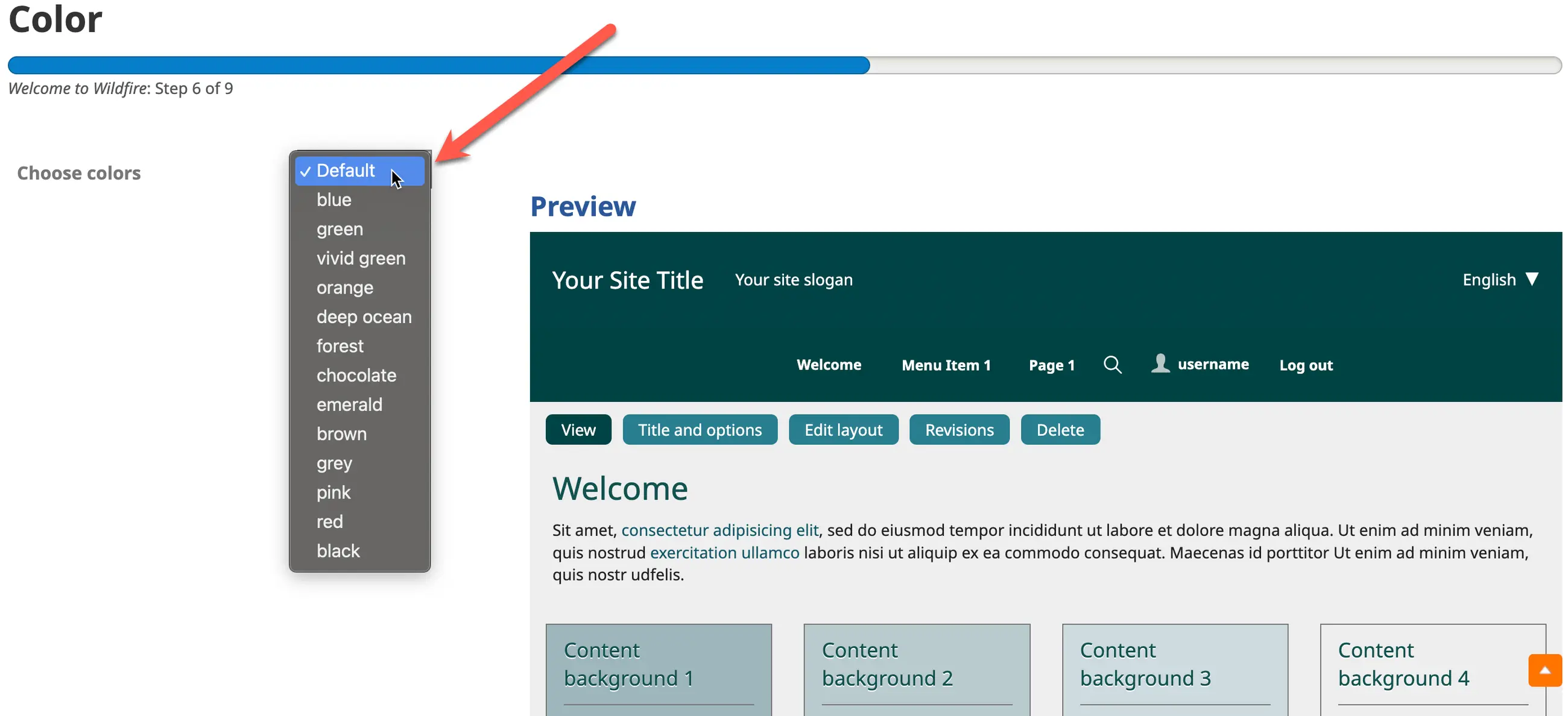 1. Each theme has a default color scheme, as shown in the preview image on this screen. You may change the color scheme by selecting from the options.
