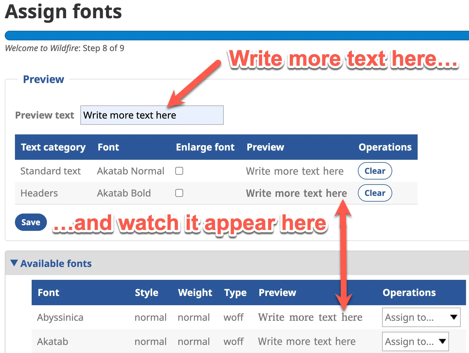 d) To save your choice and stay on this screen, click on the Save button at the bottom left of the Assign fonts screen. This allows you to try different fonts before moving off this screen.