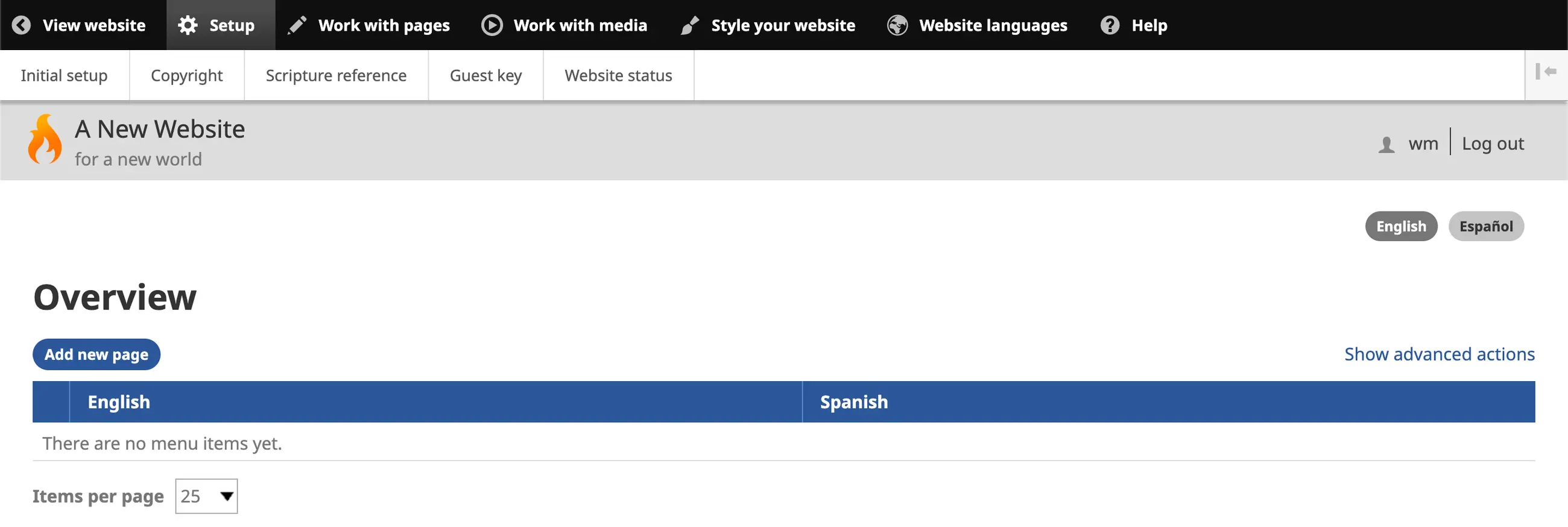 3. After clicking on the button Save and go to Work with pages, you will arrive at the website Overview screen.