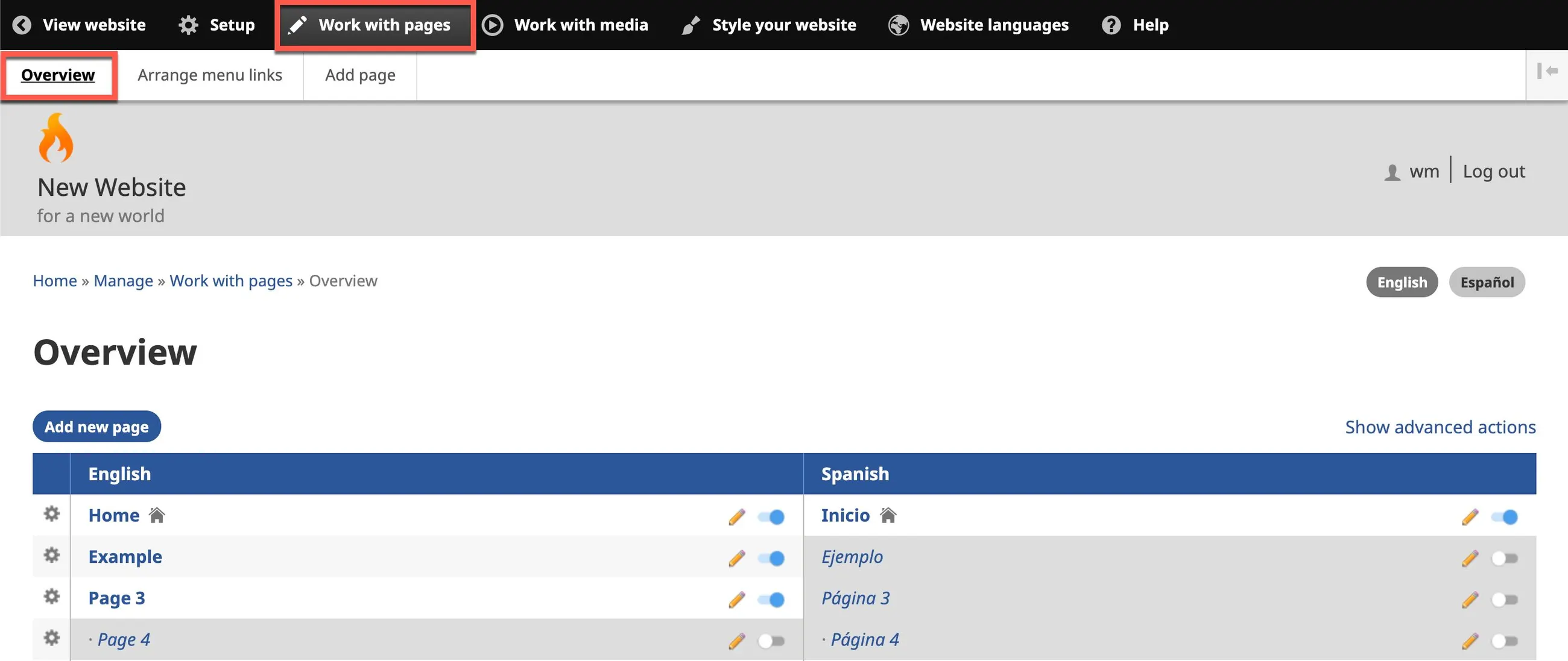 1. Navigate to the Overview screen by clicking on Work with pages in the Wildfire menu, then clicking on sub-menu item Overview.