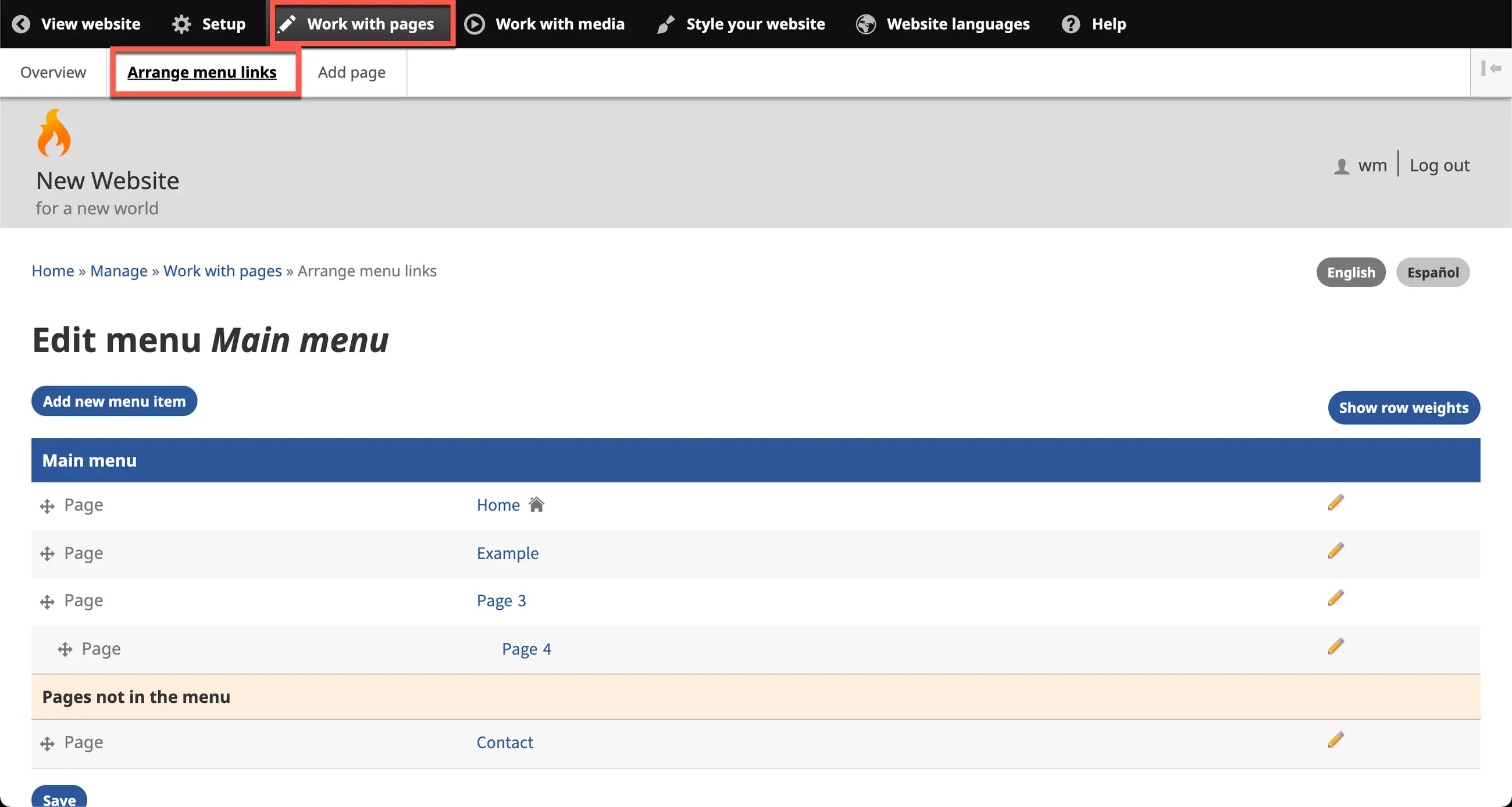 a) On the Wildfire menu, click on Work with pages, then click on sub-menu item Arrange menu links.