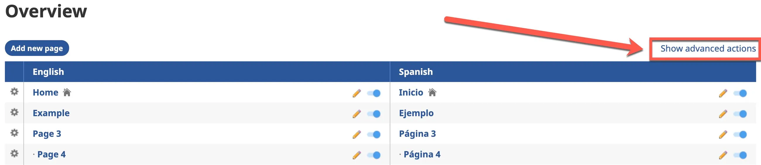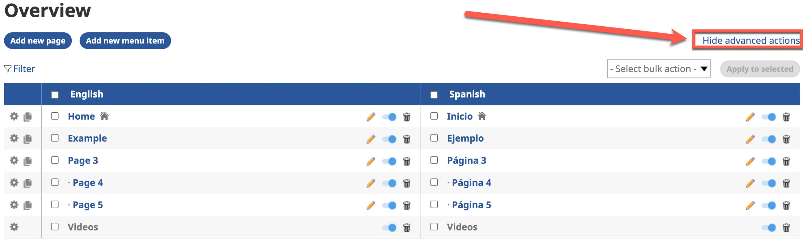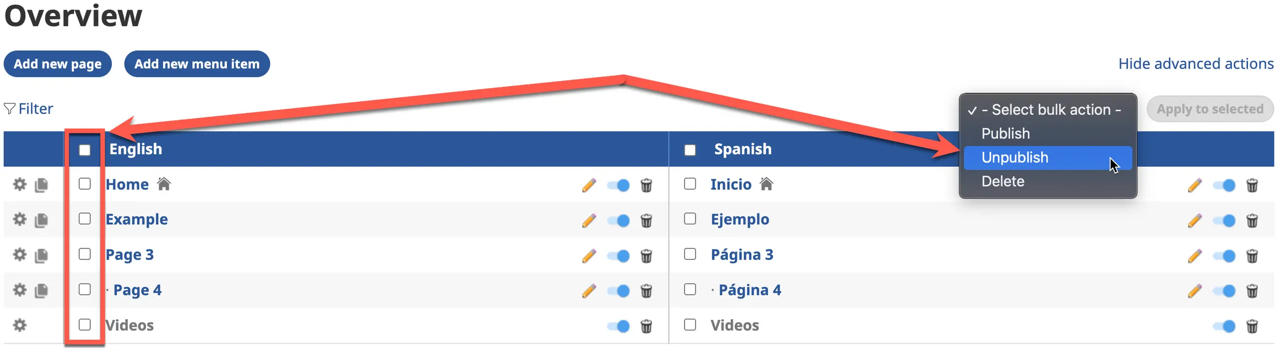 a) Click on the boxes next to page titles to select pages for bulk actions.