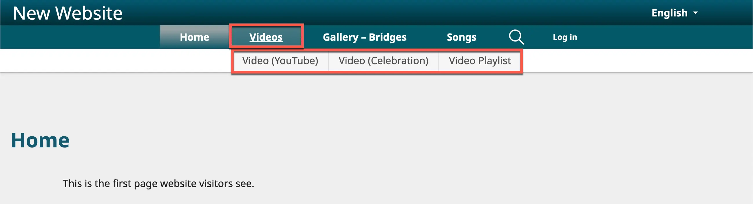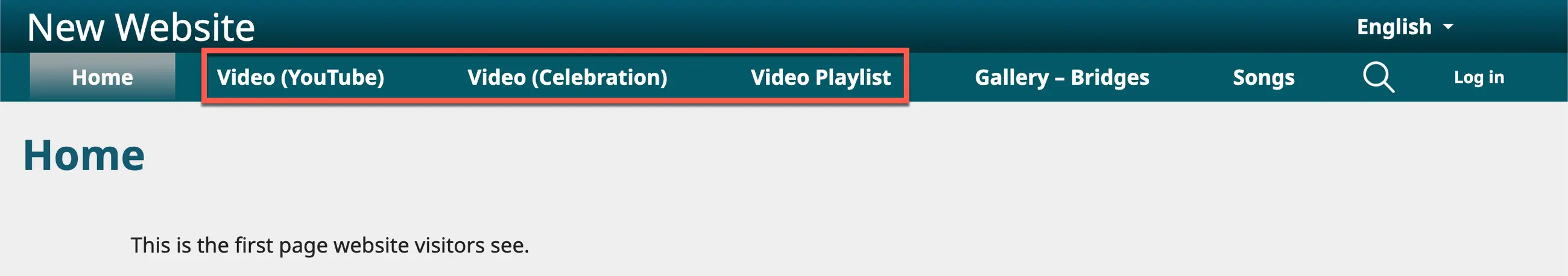 For example, you may have several website pages with video items. Create a menu item titled Videos, with no associated page. Then group (indent) the video pages under this menu item. (See the following images.)