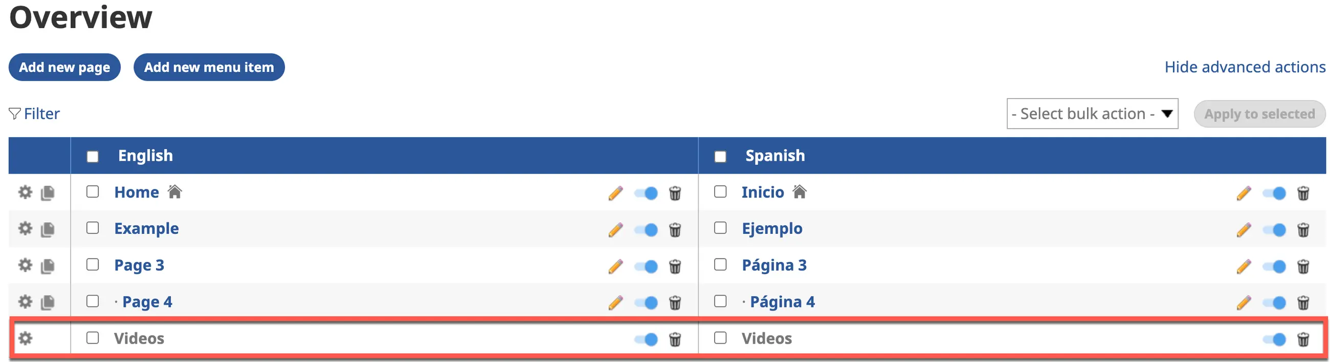 3. The page is immediately copied and added to the Overview chart. It will be at the bottom of the chart in the section titled Pages not in the menu.