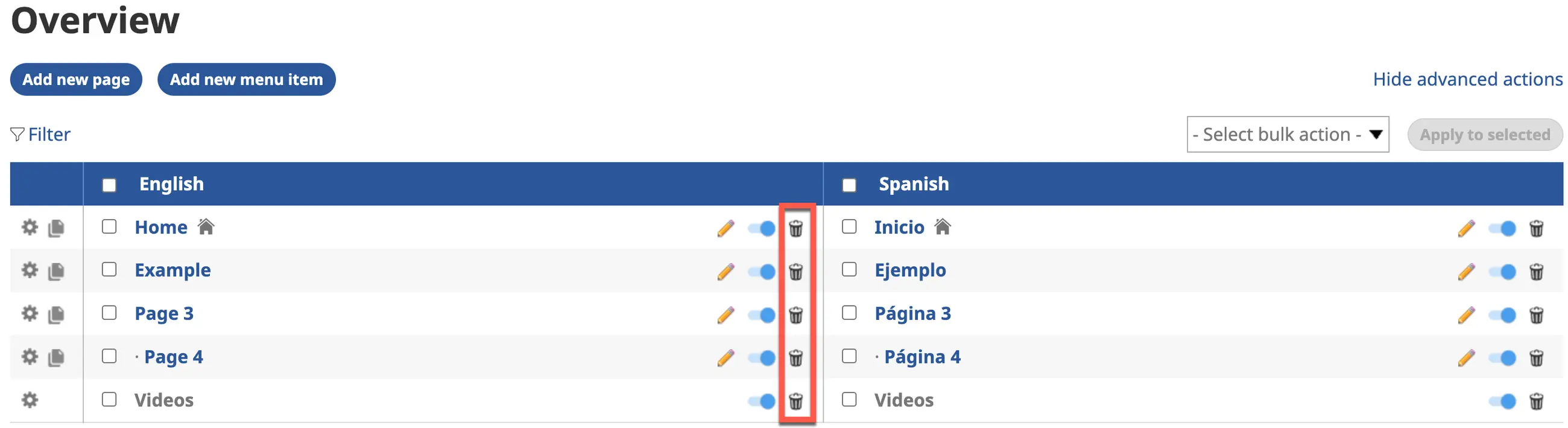 a) On the Overview chart, click on a trash can icon to delete a page.