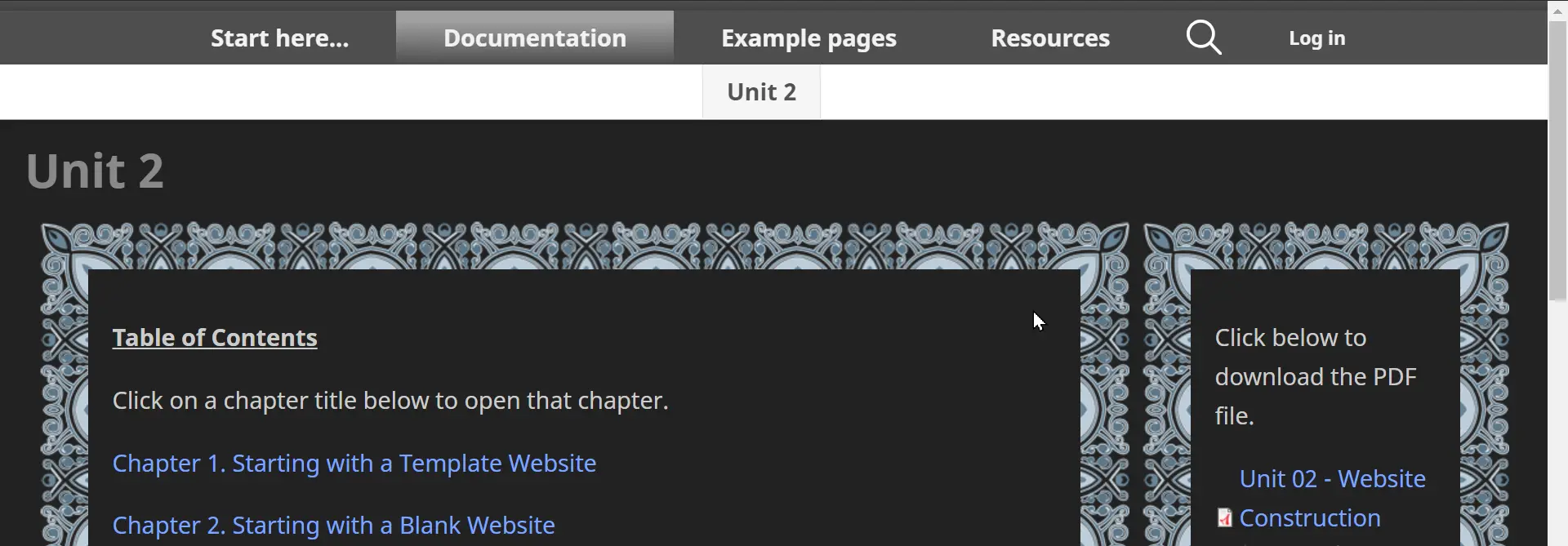 There are four styles of border art, and you may choose whether the border surrounds the whole page (everything under the menu) or just the page content (each content block separately). Your Digital Publishing Manager will configure the border art that you select.